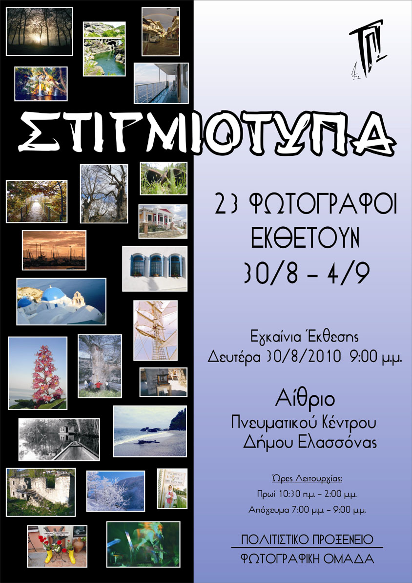 Την ερχόμενη Δευτέρα 30 Αυγούστου στο Πνευματικό Κέντρο του Δήμου Ελασσόνας θα πραγματοποιηθούν τα εγκαίνια της 1ης ομαδικής έκθεσης φωτογραφίας των μελών της φωτογραφικής ομάδας του Πολιτιστικού Προξενείου. Εικοτέσσερις φωτογράφοι εκθέτουν έργα τους με θέμα “Στιγμιότυπα” και παρουσιάζουν μια σειρά 50 και πλέον φωτογραφιών τις οποίες επέλεξαν μαζί με τον υπεύθυνο της ομάδας Ανδρέα Γκανάτσιο.
