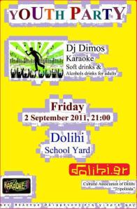 Την Παρασκευή 2 Σεπτεμβρίου 2011, ώρα 9:00 μ.μ., ο Πολιτιστικός Σύλλογος θα διοργανώσει πάρτι νεολαίας με Dj Dimos και Karaoke.