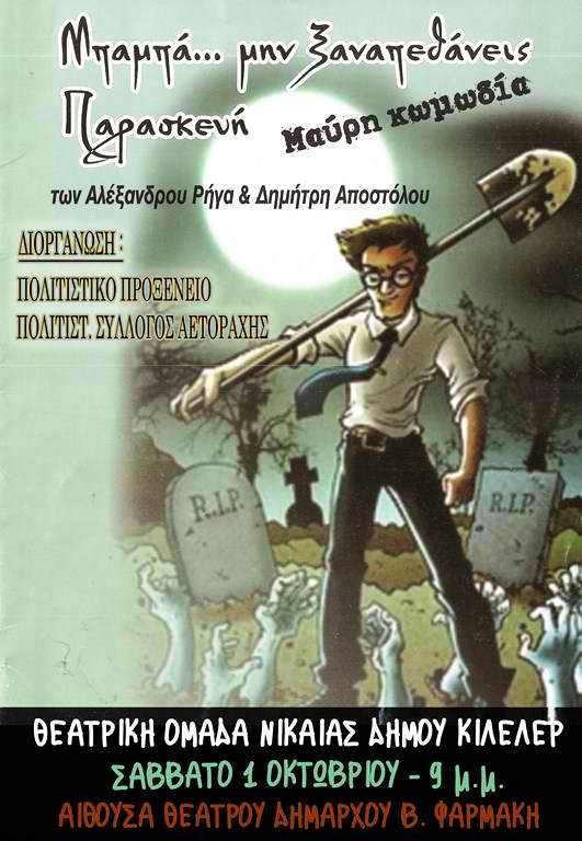 Τη θεατρική κωμωδία «Μπαμπά… μην ξαναπεθάνεις Παρασκευή» των Αλέξανδρου Ρήγα και Δημήτρη Αποστόλου παρουσιάζει το Σάββατο 1 Οκτωβρίου και ώρα 9 μ.μ. στην Αίθουσα Θεάτρου «Δημάρχου Βασίλη Φαρμάκη» στην Ελασσόνα η Θεατρική Ομάδα Νίκαιας Δήμου Κιλελέρ, σε σκηνοθεσία του Άκυ Μητσιούλη.