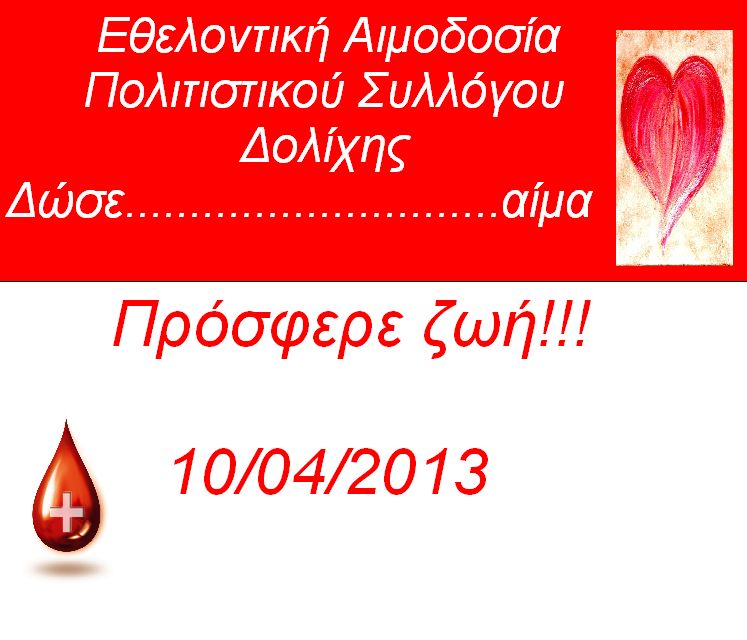 Καλούνται όσοι θέλουν και μπορούν να δώσουν αίμα, να παραβρεθούν την Τετάρτη 10 Απριλίου 2013 09:00 π.μ στο αγροτικό ιατρείο Δολίχης, εκεί όπου θα βρίσκεται η κεντρική μονάδα αιμοληψίας. Διοργάνωση: Πολιτιστικός Σύλλογος Δολίχης » Η Τριπολίτιδα»