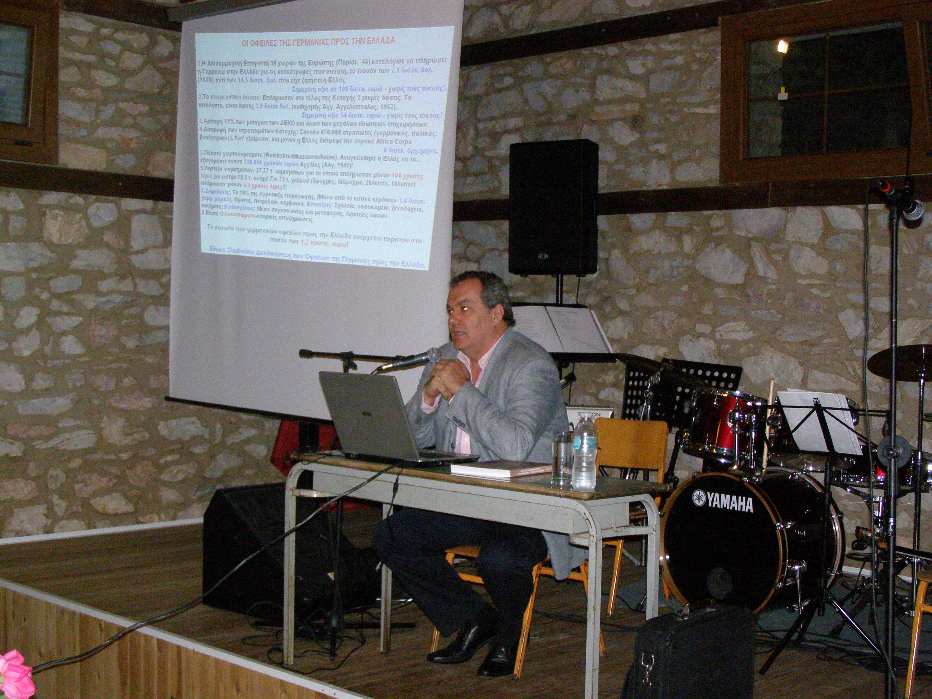 Τον λόγο πήρε ο επίσημος καλεσμένος, ο δημοσιογράφος Λεκάκης Γιώργος ο οποίος μίλησε για την αρχαιοκαπηλία των Γερμανών στην Ελλάδα επί κατοχής που όπως τόνισε χαρακτηριστικά οι Γερμανοί μας χρωστάνε, δεν τους χρωστάμε. Οι Γερμανοί κατακτητές υποσχέθηκαν την τήρηση των ελληνικών νόμων περί αρχαιοτήτων. Αλλά η Ιστορία έχει αποδείξει πως οι εξουσιαστές και οι κατακτητές είναι αναιδείς και αλαζόνες. Απ’ τον κανόνα δεν εξαιρέθηκαν οι Γερμανοί – και πώς να το πράξει ένας λαός που πιστεύει πως είναι ανώτερος όλων των άλλων;.. Υποσχέθηκαν πως μετά τον πόλεμο, θα παραδώσουν τα προϊόντα ανασκαφών δια του γερμανικού Ινστιτούτου. Το ελληνικό υπουργείο έκαμε έκκληση (αρ. 36260/1198/13.7.1942) προς την ειδική γερμανική στρατιωτική υπηρεσία προστασίας μνημείων, περί τηρήσεως των αρχαιολογικών νόμων, αλλά οι Γερμανοί την επέστρεψαν πίσω αναιδέστατα ως απαράδεκτη.