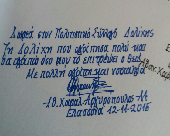 Ο Πολιτιστικός σύλλογος Δολιχης νιώθει την υποχρέωση να ευχαριστήσει δημόσια τον Αθανάσιο Αργυροπουλο (πρώην δάσκαλος δημοτικού σχολείου Δολιχης) για τη δωρεά που έκανε στη βιβλιοθήκη του συλλόγου, το βιβλίο που ο ίδιος επιμελήθηκε και αναφέρεται στην Ελληνική παράδοση με μια συλλογή απο δημοτικά τραγούδια.
