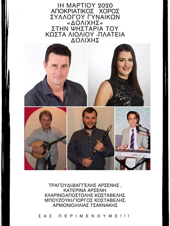 Την Κυριακή της Αποκριάς 1 Μαρτίου, ο σύλλογος γυναικών Δολίχης σας προσκαλεί στην χοροεσπερίδα που διοργανώνει στη ταβέρνα «η στάση¨του Κώστα Λιόλιου στη πλατεία Δολίχης. Μαζί μας θα είναι η ορχήστρα του Βαγγέλη Αρσένη.