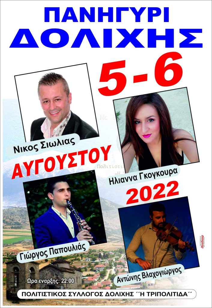 Με αφορμή την εορτή του Ιερού Ναού Μεταμορφώσεως Του Σωτήρος που δεσπόζει στην κεντρική πλατεία της Δολίχης, ο Πολιτιστικός Σύλλογος Δολίχης «Η Τριπολίτιδα» διοργανώνει πολιτιστικές εκδηλώσεις.