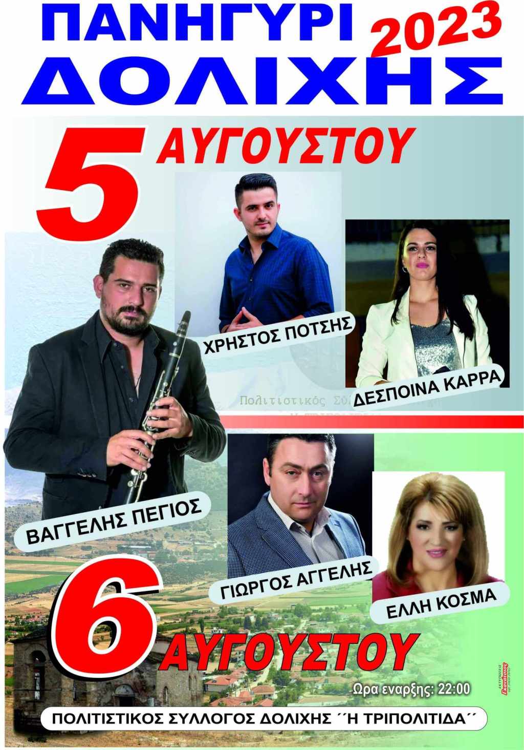 Με αφορμή την εορτή του Ιερού Ναού Μεταμορφώσεως Του Σωτήρος που δεσπόζει στην κεντρική πλατεία της Δολίχης, ο Πολιτιστικός Σύλλογος Δολίχης «Η Τριπολίτιδα» διοργανώνει πολιτιστικές εκδηλώσεις.